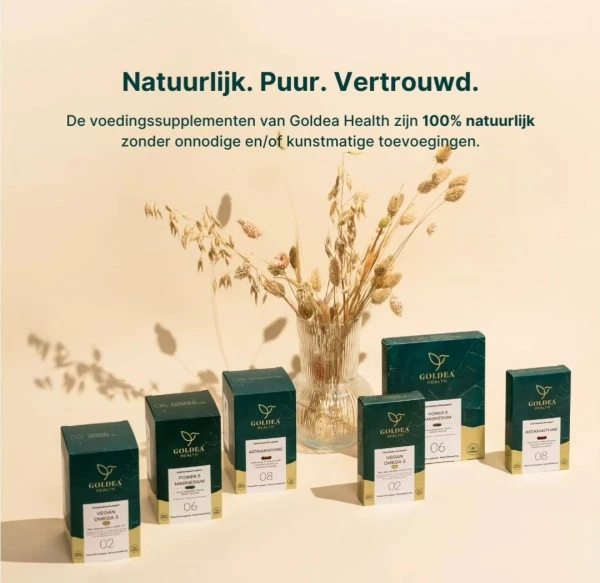 Als je je lichaam geeft wat het nodig heeft, dan werkt het altijd met je mee. Daarom is het belangrijk om te zorgen dat je lichaam alle voedingsstoffen, vitamines en mineralen binnen krijgt om zo optimaal mogelijk te zijn. Goldea Health is daarbij ook 100% vegan en vrij van kunstmatige vulstoffen.